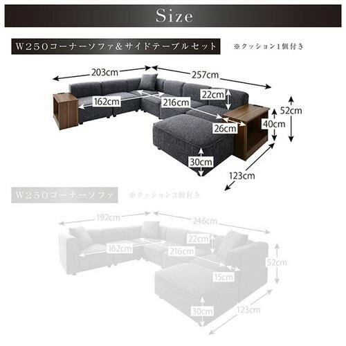 レイアウト自由自在大型L字モダンデザインコーナーソファ【サイズ】W250コーナーソファ:(約)幅246 奥行192 高さ52(座面高 30)cmW250コーナーソファ&サイドテーブルセット:(約)幅257 奥行203 高さ52(座面高 30)cmW300コーナーソファ:(約)幅300 奥行192 高さ52(座面高 30)cmW300コーナーソファ&サイドテーブルセット:(約)幅311 奥行203 高さ52(座面高 30)cm肘なし1P:(約)幅54 奥行69 高さ52(座面高 30)cm肘あり1P:(約)幅69 奥行69 高さ52(座面高 30)cmオットマン:(約)幅69 奥行54 高さ30cmサイドテーブル:(約)幅68 奥行26 高さ40cm【梱包数・梱包サイズ】W250コーナーソファ・・・10梱包1.(約)55 69 31cm・8kg /2.(約)56 56 45cm・13kg3.(約)56 56 45cm・13kg /4.(約)56 56 45cm・13kg5.(約)56 56 45cm・14kg /6.(約)54 69 16cm・7kg7.(約)56 56 45cm・14kg /8.(約)54 69 16cm・7kg9.(約)56 56 45cm・14kg /10.(約)54 69 16cm・7kgW250コーナーソファ&サイドテーブルセット・・・10梱包1.(約)55 69 31cm・8kg /2.(約)56 56 45cm・13kg3.(約)56 56 45cm・13kg /4.(約)56 56 45cm・13kg5.(約)56 56 45cm・13kg /6.(約)56 56 45cm・13kg7.(約)56 56 45cm・14kg /8.(約)54 69 16cm・7kg9.(約)73 31 10cm・8kg /10.(約)73 31 10cm・8kgW300コーナーソファ・・・11梱包1.(約)55 69 31cm・8kg /2.(約)56 56 45cm・13kg3.(約)56 56 45cm・13kg /4.(約)56 56 45cm・13kg5.(約)56 56 45cm・14kg /6.(約)54 69 16cm・7kg7.(約)56 56 45cm・14kg /8.(約)54 69 16cm・7kg9.(約)56 56 45cm・14kg /10.(約)54 69 16cm・7kg11.(約)56 56 45cm・13kgW300コーナーソファ&サイドテーブルセット・・・11梱包1.(約)55 69 31cm・8kg /2.(約)56 56 45cm・13kg3.(約)56 56 45cm・13kg /4.(約)56 56 45cm・13kg5.(約)56 56 45cm・13kg /6.(約)56 56 45cm・13kg7.(約)56 56 45cm・14kg /8.(約)54 69 16cm・7kg9.(約)73 31 10cm・8kg /10.(約)73 31 10cm・8kg11.(約)56 56 45cm・13kg肘なし1P・・・1梱包1.(約)56 56 45cm・13kg肘あり1P・・・2梱包1.(約)56 56 45cm・14kg /2.(約)54 69 16cm・7kgオットマン・・・1梱包1.(約)55 69 31cm・8kgサイドテーブル・・・1梱包1.(約)73 31 10cm・8kg【素材】生地:ポリエステル中材:天然木・チップウレタン・ポリエステル綿・ ウレタンフォーム・連結式鋼製組バネ・合板【生産国】中国【サイドテーブル】素材/プリント化粧板(強化樹脂仕上げ)機能/2口コンセント(合計1500W)生産国/中国※ソファのみ1年保証付き。